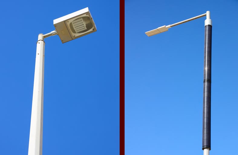 وتعتمد التقنية الأولى على الإنارة بالطاقة الشمسية، حيث تهدف إلى الاستفادة من أشعة الشمس لتوليد الطاقة الكهربائية، وذلك عن طريق تركيب الألواح الشمسية على الكشافات الذكية، التي تمثل بديلاً مستقبلياً للإنارة الكابلية التقليدية، إذ لا تحتاج إلى ربط أعمدة الإنارة بشبكة توزيع الكهرباء.