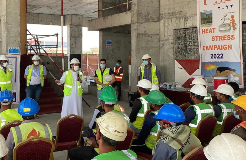 وقد حرص المختصون في إدارة البيئة والصحة والسلامة خلال الزيارات على تقديم شرح عملي لتذكير العمال والقائمين على المواقع الإنشائية بشأن توقيت حظر العمل وقت الظهيرة وأهمية الالتزام بهذا القرار حفاظاً على سلامة العمال وصحتهم العامة، وتعزيزاً للقيم الإنسانية التي تعد أولوية قصوى في دولة الإمارات العربية المتحدة، كما شهدت الزيارات الميدانية شرحاً عملياً حول ضرورة تزويد العمال بالسوائل بشكل مستمر خلال ساعات العمل تفادياً لخطر الإصابة بالإنهاك والجفاف وغيرها من الآثار المترتبة على نقص السوائل في أجسام العمال، وقدم مختصو إدارة البيئة والصحة والسلامة شرحاً عملياً بشأن منح العمال استراحة تساعدهم في تجديد النشاط والحفاظ على كفاءة أجسادهم وصحتهم العامة.