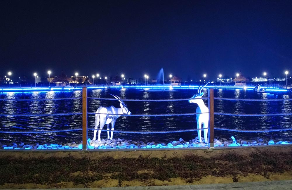 وتتضمن الواحة كراسي وسلال كأثاث خارجي تخدم الزوار ومرافق خدمية وإنارة ديكورية، ومنطقة ألعاب خشبية تتناسب مع طبيعة المكان مخصصة للأطفال، كما تحتوي على 22 مجسماً لأشكال الحياة البرية والمحلية وإنشاء أكثر من 120 موقفاً متضمنة 5 مواقف مخصصة لعربات الطعام المتنقلة مجهزة بكامل الخدمات من المياه والكهرباء والصرف، بالإضافة إلى تخصيص منطقة للشواء، وتوفير 10 مظلات جلوس. وقد تم مراعاة متطلبات أصحاب الهمم في جميع المرافق بالبحيرة، وتتميز بإضاءة ليلية تجميلية لتضفي جمالاً إلى جمال المنطقة.
