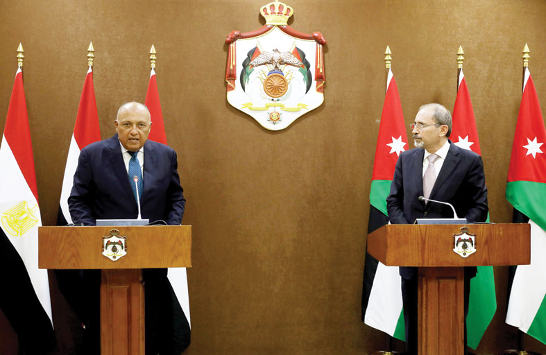 وقد التقى وزيرا خارجية مصر والأردن في عمان أمس وأكد وزير الخارجية المصري خلال اللقاء على مواصلة القاهرة مساعيها لتعزيز وقف إطلاق النار في قطاع غزة، وضرورة إعادة إحياء مسار السلام، وتقديم الدعم والمساندة اللازمين للشعب الفلسطيني. وقال متحدث باسم وزارة الخارجية المصرية في تويتر إن الزيارة تأتي تعبيراً عن الموقف المصري الثابت من مواصلة دعم الشعب الفلسطيني.