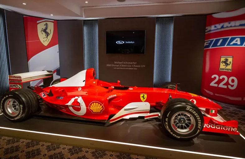 تم بيع سيارة فيراري التي كان يقودها النجم مايكل شوماخر في مشواره نحو الفوز ببطولة العالم للفورمولا 1 عام 2001 في مزاد علني مقابل 16 مليون يورو على هامش سباق جائزة موناكو الكبرى . وقال دار "رم إم سوذربيز" للمزادات إن الفائز به حصل على السيارة مقابل 15.98 مليون يورو شاملة الرسوم، بينما ذكرت صحيفة نيويورك تايمز أن المزاد على السيارة بدأ بـ8 ملايين يورو. وأضافت الصحيفة أن السيارة بيعت لأحد الضيوف المتواجدين في منطقة كبار الشخصيات بحلبة السباق، الذي فاز به السائق البريطاني لاندو نوريس. وفاز شوماخر بطل العالم 7 مرات بهذه السيارة بسباق جائزة موناكو الكبرى عام 2001. وقالت صحيفة نيويورك تايمز إن هذا السعر هو أعلى رقم على الإطلاق دفع لسيارة فيراري في مسابقات فورمولا 1.