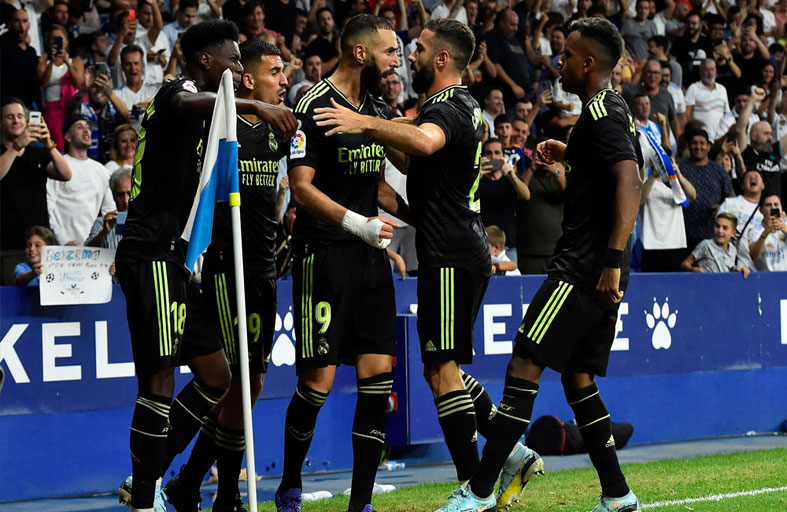 احتفى ريال مدريد حامل اللقب بهدافه الفرنسي كريم بنزيمة ومدربه الإيطالي كارلو أنشيلوتي بالفوز على مضيفه إسبانيول 3-1، فيما واصل برشلونة عروضه القوية وحقق فوزه الثاني توالياً على حساب ضيفه بلد الوليد برباعية نظيفة بينها ثنائية للنجم البولندي روبرت ليفاندوفسكي، ضمن منافسات المرحلة الثالثة من الدوري الإسباني لكرة القدم .