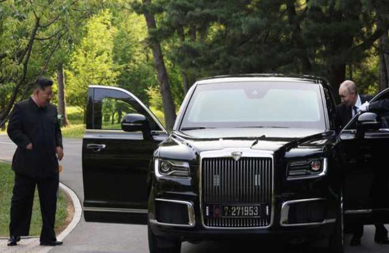 وأظهر مقطع مصور بثه التلفزيون الحكومي الروسي بوتين وهو يتولى قيادة سيارة أوروس مدرعة سوداء اللون، وهي مماثلة لسيارته الرئاسية الرسمية في روسيا، بينما جلس كيم إلى جانبه.