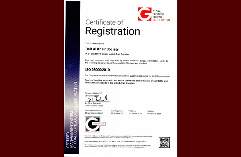 نجحت جمعية بيت الخير للمرة الثالثة على التوالي في الحصول على شهادة "الآيزو" للمسؤولية المجتمعية وفق المواصفة 26000 والتي حصلت عليها لأول مرة عام 2015 منفردة بين الجمعيات الخيرية داخل الدولة وذلك لمشاريعها التي أنجزتها في مجالات التعليم والصحة والبيئة. وشهدت السنوات العشر الأخيرة طفرة في الاهتمام بهذه المجالات فأنفقت الجمعية على تعليم أبناء الأسر المعسرة والمحتاجة 60 مليون درهم وعلى مشروع "علاج" 52 مليون درهم وساهمت في تنظيف البيئة من أطنان الملابس والمقتنيات المستعملة والكتب والأوراق والأجهزة الإلكترونية القديمة وباعتها لشركات التدوير وحققت عائدات تقدر بحوالي 43 مليون درهم خصص جزء مهم منها أيضا لدعم التعليم. وأثبتت "بيت الخير" التي دخلت عامها الثالث والثلاثين أنها انبثقت من حرص مؤسسيها الأوائل على تحقيق التكافل المجتمعي داخل الدولة فخصصوا عطاء الجمعية للنهوض بالأسر المواطنة المتعففة التي تعاني من ضعف الدخل أو عجز العائل بفقدانه أو إصابته بمرض عضال أو خروجه من الوظيفة لسبب أو لآخر.