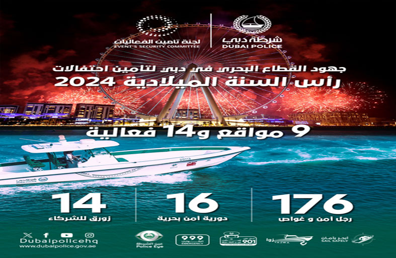 ساهم القطاع البحري في لجنة تأمين الفعاليات في دبي، في تأمين 9 مواقع بحرية و14 فعالية خلال احتفالات رأس السنة الميلادية 2024، وذلك من خلال تسيير 16 دورية أمن بحري ضمت 176 فرداً وغواصاً من الفرق التخصصية في أقسام الإنقاذ البحري والأمن البحري إلى جانب مشاركة 14 زورقاً للشركاء الاستراتيجيين في لجنة تأمين الفعاليات.
