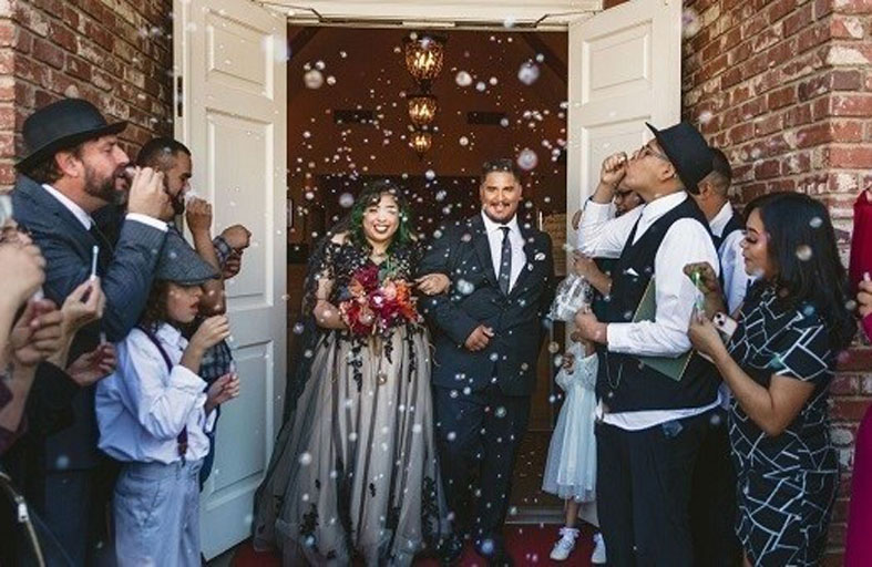 وبعد قراءة عهود الزواج، التي أقيمت في المنطقة المخصصة عادةً لخدمات حرق الجثث، توجه المحتفلون إلى حفل استقبال مستوحى من عيد الهالووين بنظام الألوان الأحمر والأسود والقرع والشموع المعلقة.