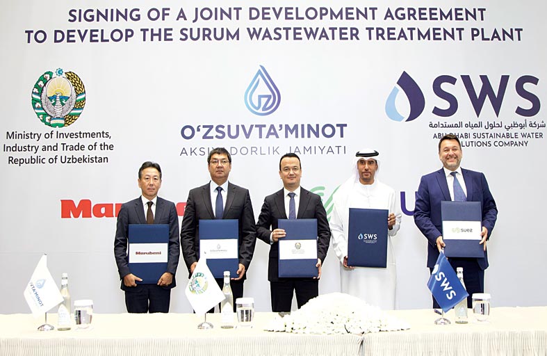 وقع تحالف يضم كلاً من “شركة أبوظبي لحلول المياه المستدامة، و"ماروبيني" اليابانية و"سويز" الفرنسية، اتفاقية تطوير مشتركة مع وزارة الاستثمار والصناعة والتجارة بجمهورية أوزبكستان، وشركة “أوسفتامينوت”، لتطوير أكبر محطة لمعالجة مياه الصرف الصحي في طشقند ، بقيمة تتجاوز مليار دولار أمريكي.