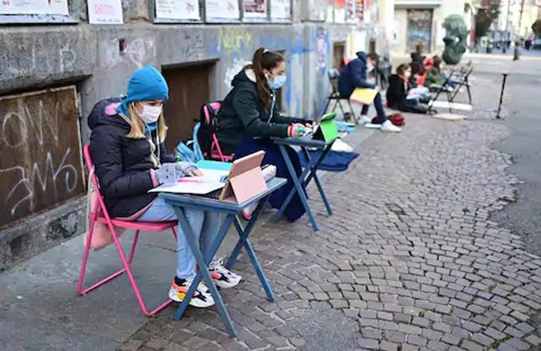 فمنذ السادس من تشرين الثاني-نوفمبر، وهو التاريخ الذي صنفّت فيه الحكومة بييمونتي ضمن قائمة "المناطق الحمراء"، تتوجّه أنيتا إياكوفيلي كلّ يوم برفقة والدتها إلى مدرسة إيتالو كالفينو وتضع أمام مدخلها كرسيا وطاولة جلبتهما معها لمتابعة الحصص من بعد.