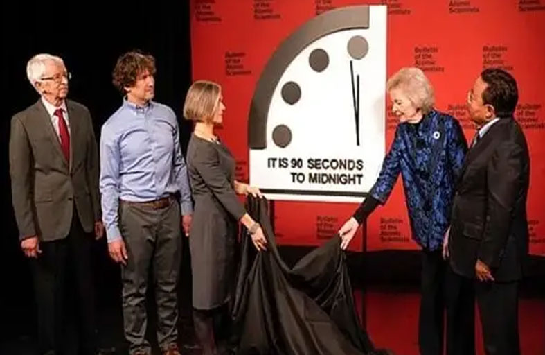 حرّك علماء الذرة، عقارب “ساعة يوم القيامة” الرمزية لتصبح عند 90 ثانية فقط قبل منتصف الليل، الذي يعني وصولها إليه نشوب حرب نووية تُفني البشرية. واستندوا في ذلك إلى عوامل تقود مخاطر وقوع كارثة عالمية، مثل موقف روسيا تجاه الأسلحة النووية وسط غزوها لأوكرانيا وحرب إسرائيل المسلحة نوويا في غزة، فضلاً عن أزمة تغير المناخ. وبدأت روسيا حربها على أوكرانيا في فبراير -شباط 2022، بينما شنت إسرائيل حربها على حركة حماس، عقب شن مسلحيها هجوماً دامياً على جنوب إسرائيل، في السابع من أكتوبر -تشرين الأول الماضي. وقالت نشرة علماء الذرة إن العلماء حددوا ذلك التوقيت الذي يشير إلى إمكانية فناء العالم بناء على مخاطر “وجودية” تهدد الأرض وسكانها مثل التهديدات النووية، وتغير المناخ، وكذلك التقنيات المدمرة مثل الذكاء الاصطناعي والتكنولوجيا الحيوية الجديدة. وقالت راشيل برونسون رئيسة النشرة ومديرتها التنفيذية لرويترز “بؤر الصراع الساخنة في أنحاء العالم تحمل خطر التصعيد النووي، وتغير المناخ يسبب بالفعل الموت والدمار، والتقنيات المدمرة مثل الذكاء الاصطناعي والأبحاث الحيوية تتقدم بشكل أسرع من الضمانات التي توفرها». وأضافت أن إبقاء الساعة دون تغيير عن العام السابق “ليس مؤشراً على أن العالم مستقر». وصممت منظمة غير ربحية مقرها شيكاغو هذه الساعة عام 1947 خلال الحرب الباردة، التي أعقبت الحرب العالمية الثانية، لتحذير الناس من مدى اقتراب البشرية من تدمير العالم. وقالت برونسون إن الاتجاهات التي تنذر بالسوء لا تزال تشير إلى كارثة، بما في ذلك حقيقة أن الصين وروسيا والولايات المتحدة تنفق مبالغ مالية طائلة لتوسيع ترساناتها النووية أو تحديثها، وهو ما يزيد من خطر نشوب حرب نووية عن طريق الخطأ أو سوء التقدير. وأضافت “تبدو النهاية الدائمة للحرب الروسية في أوكرانيا بعيدة المنال، ولا يزال استخدام روسيا للأسلحة النووية في ذلك الصراع احتمالاً جدياً. وفي العام الماضي أرسلت روسيا العديد من الإشارات النووية المثيرة للقلق».