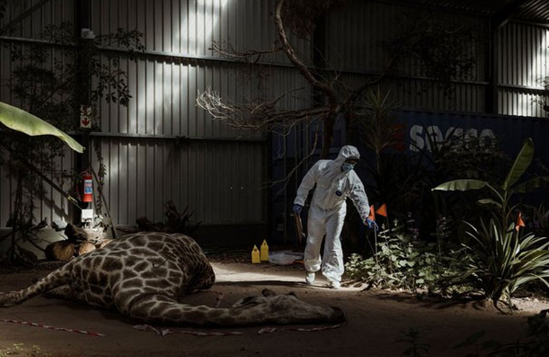 يدور ثلاثة أشخاص يرتدون بزات بيضاء حول جيف مشوّهة لوحيد قرن وأسد وزرافة تحمل آثار أقدام... إنّه مسرح جريمة وهمي لطلاب مركز تحقيق تقني وعلمي يسعى إلى مكافحة الصيد الجائر في جنوب أفريقيا.