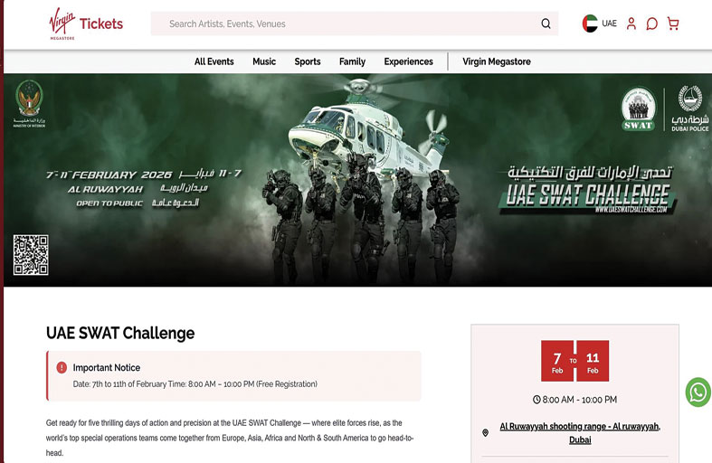 أعلنت اللجنة المُنظمة لتحدي الإمارات للفرق التكتيكية "سوات 2026"، بالتعاون مع الموقع الإلكتروني للتذاكر "فيرجن ستور"، عن طرح تذاكر مجانية لأفراد الجمهور الراغبين في حضور المنافسات وتشجيع فرق بلدانهم المشاركة في التحدي الخاص بالوحدات الشرطية وفرق التدخل السريع والفرق التكتيكية من مختلف دول العالم.