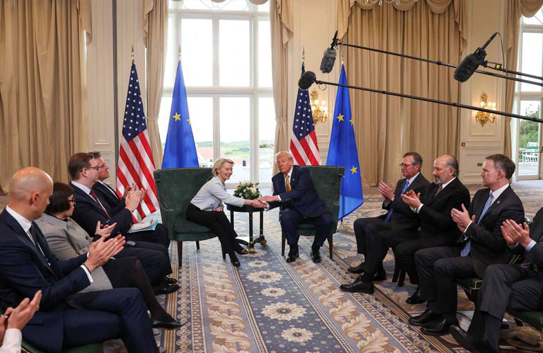 والتقى ترامب مع رئيسة المفوضية الأوروبية أورسولا فون دير لاين في تورنبري، باسكتلندا، يوم الأحد، لإبرام اتفاق ثنائي بشأن الرسوم الجمركية.