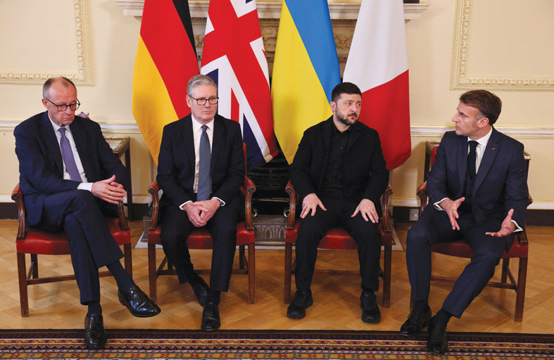 واجتمع رئيس الوزراء البريطاني كير ستارمر والرئيس الفرنسي إيمانويل ماكرون والمستشار الألماني فريدريش ميرتس مع زيلينسكي لنحو ساعتين تقريبا بعدما اتهمه الرئيس الأميركي دونالد ترامب بأنه لم يطلع على مقترحه الأخير لإنهاء النزاع مع روسيا والذي لم تُكشف تفاصيله بعد.