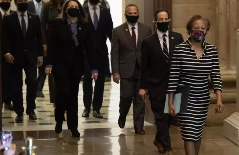 وفي ذلك اليوم أيضا يؤدي أعضاء مجلس الشيوخ اليمين ليصبحوا محلفين في هذه الآلية التاريخية لسببين، إذ أنها المرة الأولى التي يتعرض فيها رئيس أميركي لآليتي عزل، والمرة الأولى التي يحاكم فيها رئيس بعد خروجه من البيت الأبيض. وحمل النواب التسعة الذين عيّنتهم رئيسة المجلس نانسي بيلوسي “مدّعين عامّين”، بيان الاتهام وعبروا به وسط صمت مهيب مساء الإثنين الأروقة الطويلة المزينة باللوحات والتماثيل المؤدية إلى مجلس الشيوخ والتي اقتحمها متظاهرون مؤيدون لترامب قبل أقل من ثلاثة أسابيع. ثم تلا رئيسهم جايمي راسكين التهمة الموجّهة إلى الرئيس السابق والتي لا يزال وقعها شديدا على أعضاء مجلسي الكونغرس الذي كانوا بأنفسهم شهودا لا بل هدفا لأعمال العنف.