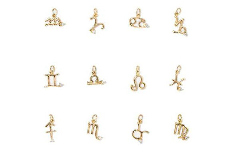 قلادة من الذهب عيار 14 لأصحاب برج القوس من بروك غريغسون بسعر 2000 دولار. مجموعة من المجوهرات الذهبية تمثل مختلف الأبراج من ستون آند ستراند بسعر 370 درهم.