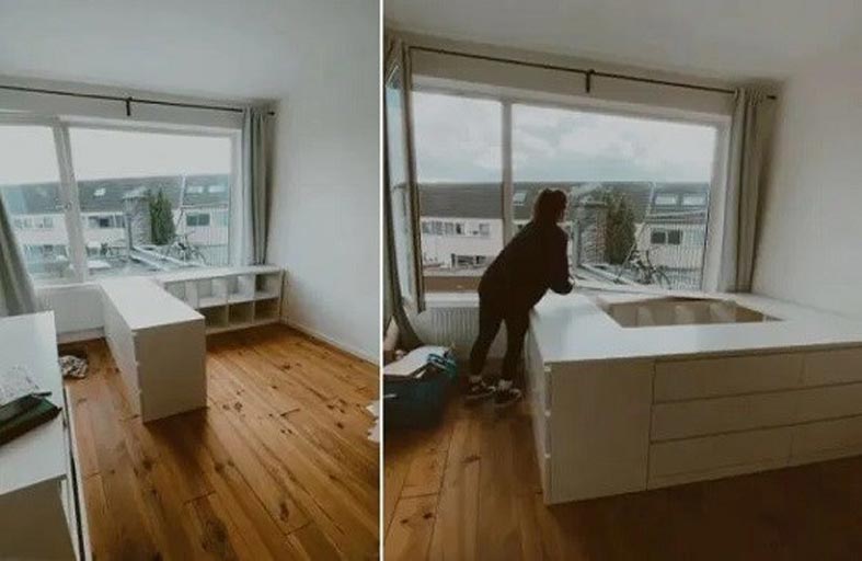 تمكنت بريطانية من توفير مساحة واسعة في شقتها الصغيرة بإنشاء هيكل سرير باستخدام أدراج آيكيا.