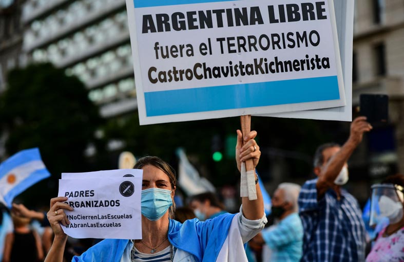 ولوح المتظاهرون بأعلام الأرجنتين مرددين شعارات مناوئة للرئيس ألبرتو فرنانديز، واحتجوا خصوصا على تعليق الدروس حضوريًا في المدارس لمدة 15 يوما وهو قرار يدخل حيز التنفيذ الاثنين في العاصمة ومحيطها.