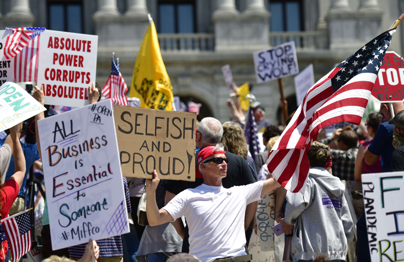 وندّد المتظاهرون بالقيود التي فرضها الحاكم الديمقراطي توم وولف وفريقه ويعتبرون أنّها مفرطة.