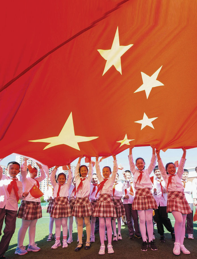تلاميذ المدارس يحملون علمًا صينيًا عملاقًا قبل الاحتفال باليوم الوطني للبلاد في الأول من أكتوبر. ا ف ب