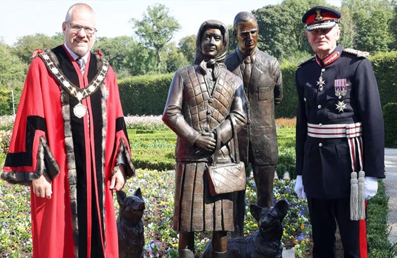 وفي التمثال، تظهر الملكة إليزابيث الثانية واقفة بجوار زوجها الأمير الراحل فيليب، وكلبيهما من فصيلة الكورجي.