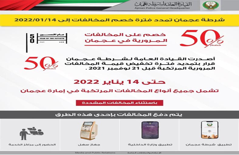 أعلنت القيادة العامة لشرطة عجمان عن تمديد فترة تخفيض قيمة المخالفات المرورية بنسبة 50 في المئة وإلغاء حجزالمركبات والنقاط المرورية، حتى تاريخ 14 يناير 2022.