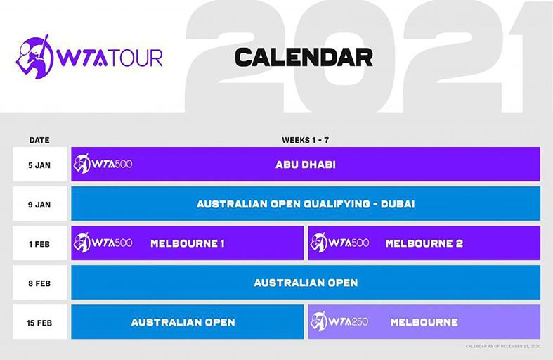 أعلن اتحاد لاعبات التنس الاحترافي"WTA" برنامج بطولاته للأسابيع السبعة الأولى من أجندة عام 2021 في ظل الحرص الكبير على استمرارية البطولات وتعزيز مشاركة الرياضيين في كافة الفعاليات مع مراعاة الإجراءات الاحترازية والتدابير الوقائية.