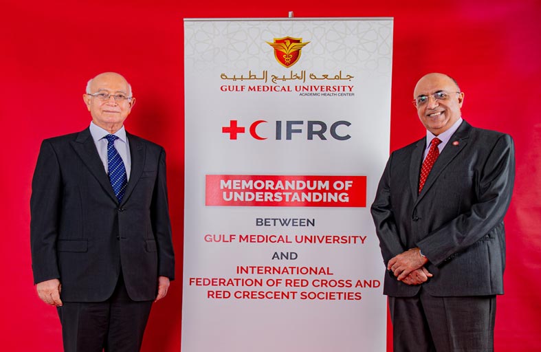 وقع البرفسور حسام حمدي مدير جامعة الخليج الطبية مع الدكتور فوزي عبدالله ممثل مكتب الاتحاد الدولي لمجموعة دول الخليج اتفاقية تعاون بين الاتحاد الدولي للصليب الأحمر و الهلال الأحمر و جامعة الخليج الطبية. و في هذا الإطار تم الإعلان عن إنشاء مركزجامعة الخليج الطبية للقيادة و التدريب للعاملين و المتطوعين في المجال الإنساني و يشمل ذلك العمل في مشاريع متعلقة بالكوارث و بصحة الإنسان و مكافحة الأمراض و الأوبئة.