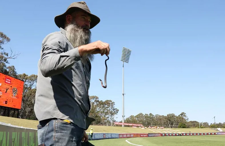 وشوهد الثعبان الأسود ذو البطن الحمراء، وهو من الأنواع السامة الموجودة في أنحاء شرق أستراليا، يزحف على أرض المعلب بإستاد بلاكتاون الرياضي الدولي بغرب سيدني.
