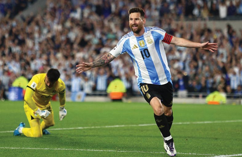 سجل النجم الأرجنتيني ليونيل ميسي ثلاثية "هاتريك" ومرر كرتين حاسمتين وقاد منتخب بلاده للفوز على ضيفه البوليفي 6-0 على ملعب "ماس مونومنتال" في العاصمة بوينوس آيرس، ضمن الجولة العاشرة من تصفيات قارة أميركا الجنوبية المؤهلة إلى نهائيات كأس العالم 2026 لكرة القدم. وسجل ميسي ثلاثيته في الدقائق 19 و84 و86، وصنع هدفي لاوتارو مارتينيس (43) وخوليان ألفاريس (45+3). وأضاف تياغو ألمادا الهدف الرابع (69)، أمام 85 ألف متفرج.