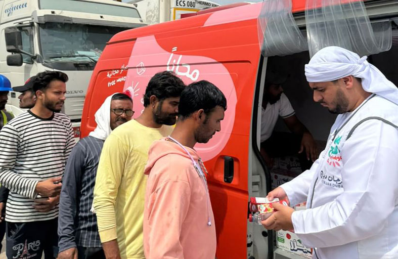ثلاجة الفريج توزع أكثر من مليون عبوة من المياه والعصائر والمثلجات على العمال في دبي خلال شهر