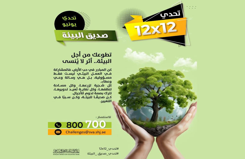 أطلقت جائزة الشارقة للعمل التطوعي تحدي شهر يونيو تحت شعار "كن صديقاً للبيئة"، ضمن سلسلة مبادراتها الشهرية "تحدي 12×12"،في إطار تعزيز الوعي البيئي وترسيخ مفاهيم الاستدامة والمسؤولية المجتمعية، بما ينسجم مع أهداف التنمية المستدامة ويعكس رؤية الشارقة في الريادة المجتمعية والعمل التطوعي.