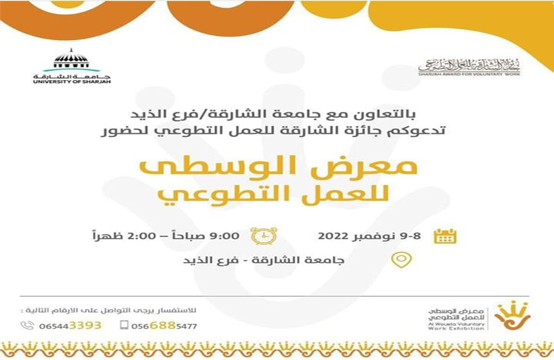 ينطلق "معرض الوسطى للعمل التطوعي" الذي تنظمه جائزة الشارقة للعمل التطوعي؛ يوم الثلاثاء بتاريخ 08 نوفمبر من العام الجاري، بمقر جامعة الشارقة بمدينة الذيد وبمشاركة عدد من الجهات الحكومة والمؤسسات ذات النفع العام، ويستمر على مدى يومي الثلاثاء والأربعاء من تاريخ 8إلى 9 نوفمبر من الشهر الجاري.