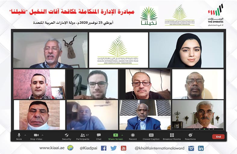 نظمت جائزة خليفة الدولية لنخيل التمر والابتكار الزراعي محاضرة افتراضية حول “مبادرة الإدارة المتكاملة لمكافحة آفات النخيل "نخيلنا"، قدمتها المهندس الزراعية حمدة محمود بالشوارب، رئيس قسم الصحة النباتية بالإنابة في وزارة التغير المناخي والبيئة بالإمارات، بمشاركة 97 شخصاً هم نخبة من المزارعين والمنتجين والأكاديميين والمختصين بزراعة النخيل وإنتاج وتصنيع التمور يمثلون 15 دولة على المستوى العربي.