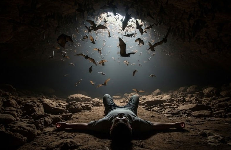 جثة رجل بين الخفافيش
