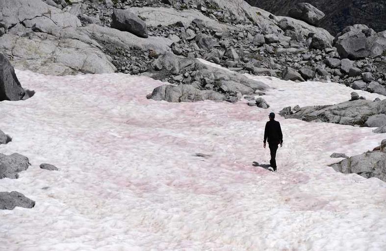 يحقق علماء في إيطاليا في ظاهرة غامضة تمثلت بظهور ثلج جليدي زهري في جبال الألب بسبب طحالب تسرّع تبعات التغير المناخي. ويدور جدل بشأن مصدر هذه الطحالب، غير أن الباحث في المجلس الوطني للبحوث في إيطاليا بياجو دي ماورو قال إن الثلج الزهري الذي ظهر في أجزاء من مجلدة بريسينا ناجم على الأرجح من نوع نباتي موجود أيضا في غرينلاند.