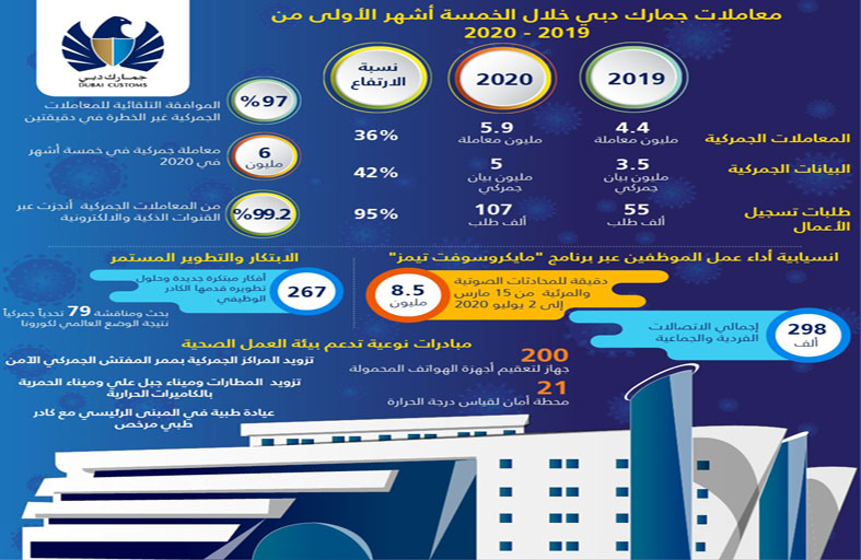 أدت جمارك دبي دورا رئيسيا لدعم سلسلة الإمداد عالميا ومحليا وتمكنت من تلبية متطلبات مرحلة الإجراءات الاحترازية لمواجهة كوفيد 19 بالكامل مع مواصلة العمل على مدار الساعة دون التأثر بهذه الإجراءات بفضل التقدم الكبير الذي حققته طوال السنوات الماضية في تطوير واستخدام أنظمة وتطبيقات تقنية المعلومات الذكية فالعمليات الجمركية يتم إنجازها بالكامل من خلال نظام مرسال 2 الذي طورته الدائرة كمنصة ذكية متكاملة للعمليات والخدمات الجمركية.