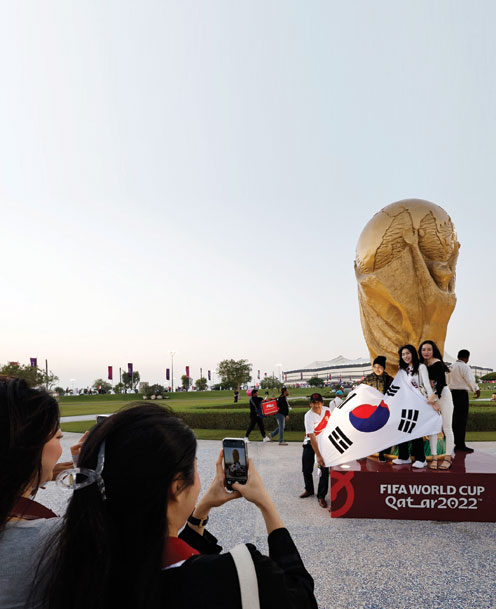 جماهير من كوريا الجنوبية يقفون لالتقاط صورة أمام نسخة طبق الأصل من كأس العالم في قطر -رويترز