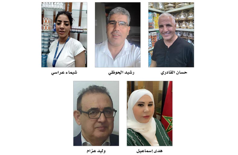 - وليد عزام.. يعرض ويبيع الزيوت المغربية والصابون والشاي والكريمات والنحاسيات والطاجين وأشياء أخرى.. وعن ومعروضات أخرى ويقول "أعرض وأبيع أصناف عديدة من المنتجات المغربية.. منها الزيوت الطبيعية وأهمها زيت الأرجان الذي يستخدم للتجميل والشعر والبشرة وأنواع عديدة من الكريمات التي تستخدم في العديد من الأغراض الجمالية والعلاجية.. والصابون المغربي بأنواعه المتعددة منها الصابون الأسود للحمام المغربي المصنوع من زيت الزيتون ومواد طبيعية والذي يرطب الجسم ويحيي خلايا البشرة الميتة.. والصابون بأنواعه والشاي المغربي بكل أنواعه المختلفة.. والطواجين الفخارية المغربية والخاصة بالطهي أو تقديم الأكل وهي بأشكال ومقاسات وبعض الأدوات المنزلية.. والكثير من المخللات مثل الزيتون والليمون وأيضا الهريسة والعسل البري النقي .. والدقيق المغربي بأنواعه والكسكسي المغربي وزيت الزيتون والكثير من البهارات المغربية".