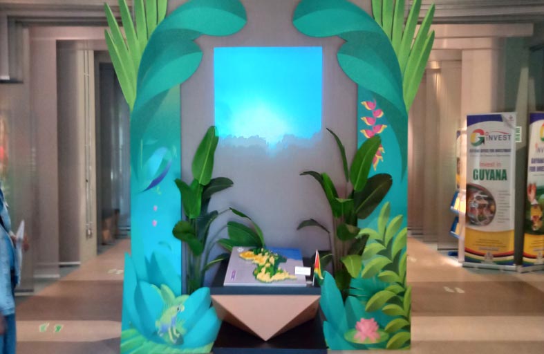 يستقبل جناح غيانا زواره بتصميم داخلي مبدع مستوحى من أرضه الخضراء، شاشة صغيرة وسط لوحة اضيف إليها نماذج من أغصان شجر خضراء كتب فيها كلمات ترحيب، وجاء التصميم الداخلي مفتوح ليعطي الجمهور حرية في التحرك ومشاهدة المقتنيات بأريحية كبيرة، فعلى الممر الأيمن وبجور باب الدخول يلاحظ الزائر وجود سرير استرخاء بطن بغطاء مرسوم ويعتبر لوحة تعكس رؤية غيانا والاهتمام بالطبيعة وسرد قصة طرزان، وبجوار هذه التحفة الفنية شاشة كبيرة تستعرض تاريخ غيانا وتراثها وأهم المعالم السياحية فيها، بالإضافة إلى صناديق زجاجية تضم نماذج ومجسمات فنية بالحجم المصغر منحوتة للبيئة وما فيها من مجتمع بشري تحت مظلة ومن حولهم الحيوانات والطيور والأشجار في صورة تضم التكيف المجتمعي.
