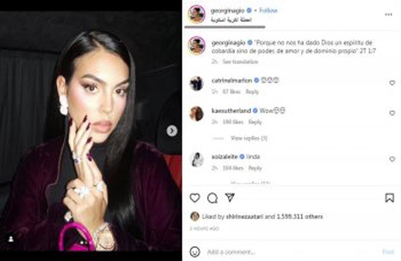 أطلت عارضة الأزياء جورجينا رودريغز حبيبة لاعب كرة القدم البرتغالي كريستيانو رونالدو على الجمهور بإطلالة جديدة إنما بدت فريدة بعض الشيء في هذه المرة حيث استخدمت الكتابة باللغة العربية من خلال منشورها.