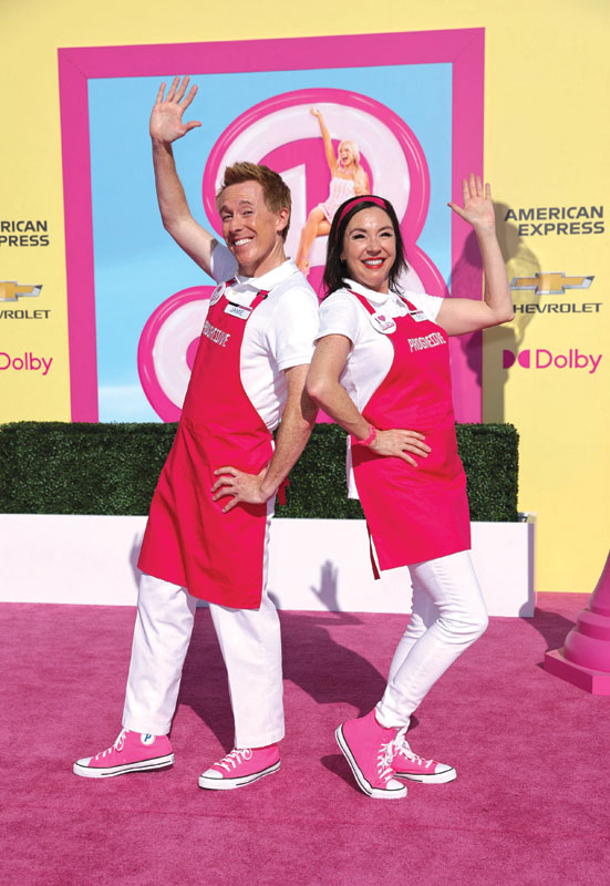 جيمي وفلو يقفان على السجادة الوردية لحضور العرض العالمي الأول لفيلم «باربي» في لوس أنجلوس. (رويترز)