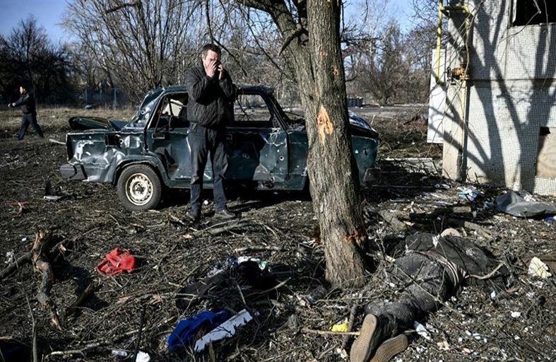 يجهش شاب في الثلاثين من عمره بالبكاء أمام جثة والده الذي قُتل في قصف على حيّ سكنيّ في تشوهويف في شرق أوكرانيا، مركز الهجوم الذي أطلقته روسيا ليل الأربعاء الخميس، ويقول بأسى “طلبت منه المغادرة».