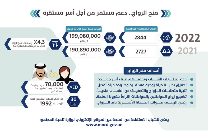 كشفت معالي حصة بنت عيسى بوحميد، وزيرة تنمية المجتمع، أن إجمالي المبالغ التي تم صرفها كمنح مالية للزواج خلال العام الماضي 2022، بلغ 199,080,000 درهم إماراتي، شملت 2,844  مستفيداً على مستوى إمارات الدولة، مقارنة بــ 2,727 مستفيداً من المنحة خلال العام 2021.