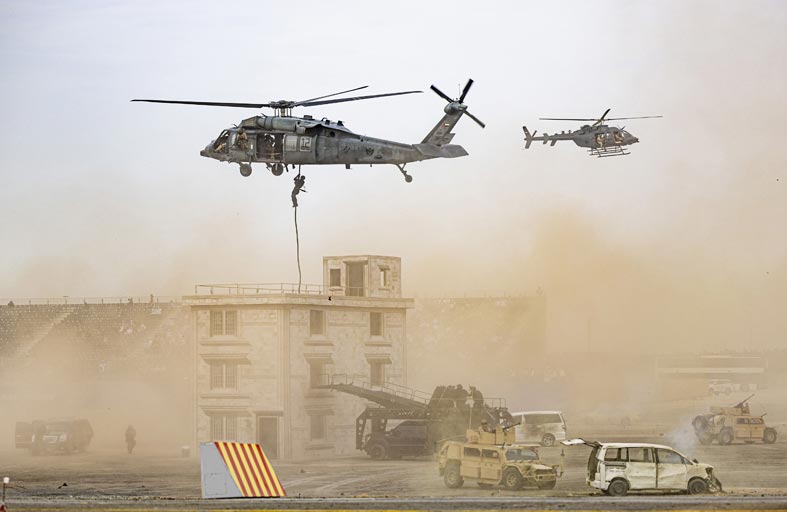واشتملت السيناريوهات على التعامل مع عمليات تحرير رهائن على متن سفينة مختطفة في عرض البحر، وتعرض موكب شخصية مهمة لهجوم إرهابي وكمين وكيفية التعامل معه، وتعرض شخصية مهمة لمحاولة اغتيال، وتنفيذ غارات جوية على مواقع معادية، وعملية اقتحام لشاطئ وتنفيذ إنزال بحري وجوي، وعملية إخلاء لجرحى ومصابين مع تأمين جوي، إلى جانب تأمين أمني لفعاليات كبرى باستخدام تكنولوجيا الروبوتات والذكاء الاصطناعي والطائرات المُسيّرة، بالإضافة إلى عدد من السيناريوهات الأخرى.