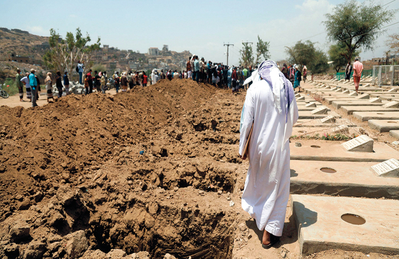 وتحمل مجموعة من الرجال لم يضعوا بغالبيتهم الكمامات أو القفازات، النعوش إلى مقبرة السعيد في المدينة التي يحاصرها المتمردون الحوثيون منذ سنوات، حيث حفرت صفوف من القبور الجديدة. وتصل شاحنة إلى المقبرة حاملة مشيعين مع المزيد من الجثث.