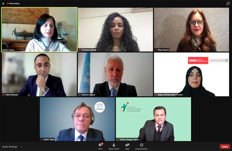 وأتاحت جلسة المشاورات التي استغرقت 90 دقيقة على منصة "زووم"، الفرصة لعقد حوارات بين أعضاء اللجنة الدولية المعنية بمستقبل التربية والتعليم ومعلمين وخبراء بارزين من المنطقة وخارجها وهم، سعادة "أنطونيو نوفوا"، سفير البرتغال لدى اليونسكو وعضو اللجنة الدولية - مبادرة مستقبل التربية والتعليم، ونجوى الحوسني، عميد كلية التربية بالإنابة في جامعة الإمارات العربية المتحدة، وكريستين صفوت، المدير التنفيذي لمؤسسة "علمني" في جمهورية مصر العربية والفائزة بجائزة حمدان اليونسكو لتنمية أداء المعلمين عن عام 2020، وإليسا جويرا، مؤسسة كلية فيلادلفيا فالي في المكسيك وعضو اللجنة الدولية - مبادرة مستقبل التربية والتعليم، وحلمي حمدان، خبير ومدرب تربوي في الاتحاد العام للمعلمين الفلسطينيين، وملك زعلوك، مدير معهد الشرق الأوسط للتعليم العالي بالجامعة الأمريكية بالقاهرة، وصبحي طويل، مدير مبادرة مستقبل التربية والتعليم باليونسكو. وتناول "الحوار بين معلمين وخبراء الدول العربية واللجنة الدولية المعنية بمستقبل التربية والتعليم" المتغيرات التي لحقت بنظم التعليم المدرسية بسبب تفشي جائحة «كوفيد-19»، وأثارها التي طالت أكثر من 63 مليون معلّم ومعلّمة في جميع أنحاء العالم. وسلّط الحوار الضوء على التحديات التي تواجهها النظم التعليمية في مدى تأهبها للتكيف بسرعة مع المتطلبات المتغيرة. ومع التحول المفاجئ في نظم التعليم إلى التعلم عن بعد، وجد المعلمون أنفسهم في بيئات غير تقليدية تتطلب ما هو أكثر من مجرد تطبيق مناهج رقمية وطرق وأدوات تدريس، حيث رسخت الجائحة ضرورة الحرص على استمرارية عملية التطوير المهني للمعلمين، وتقديم الدعم النفسي والتعلم الاجتماعي المعنوي لهم، وتعزيز حقوق المعلمين وظروف العمل الخاصة بهم، بالإضافة إلى البحث المستمر وتقييم احتياجات التعليم والتعلم المتغيرة بسرعة.