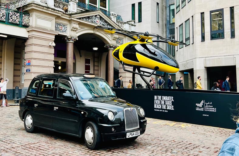 وكانت الحملة الإعلامية “استثمر في الإمارات” قد بدأت برسالة من النجم العالمي إدريس إلبا، يدعو فيها المبتكرين والمبدعين والمستثمرين حول العالم إلى الاستثمار في الإمارات، والاستفادة من البيئة الاقتصادية المتكاملة والإمكانات القوية التي تحظى بها الدولة والتي جعلتها الوجهة الأكثر جذباً للمواهب في العالم.وفيما تجوب الحملة مدنًا عالمية مثل كان، وميونيخ، وباريس، ولندن، وزيورخ، وجنيف ونيويورك، وتستهدف رواد الأعمال وأصحاب الأفكار الواعدة حول العالم، للقدوم إلى الإمارات والاستثمار فيها وتحويل أفكارهم إلى واقع، تم تفعيل حملة في لندن، المدينة التي احتضنت أول نظام سكة حديدية عامة، للتعريف بخدمات سيارات الأجرة الطائرة التجارية في الإمارات، حيث سيتم عرض نموذج بحجم كامل للتاكسي الكهربائي في قلب المدينة.ويضع الاستثمار في تطوير الحلول الأكثر ابتكاراً الإمارات في صدارة التكنولوجيا العالمية في قطاع النقل المعاصر، حيث دفعت الروح الريادية لحكومة دولة الإمارات لإطلاق أول نظام مترو وتَرام ذاتي القيادة، وبناء أكثر المطارات الدولية ازدحامًا في العالم، وإطلاق أفضل خطوط الطيران الرائدة عالميًا.