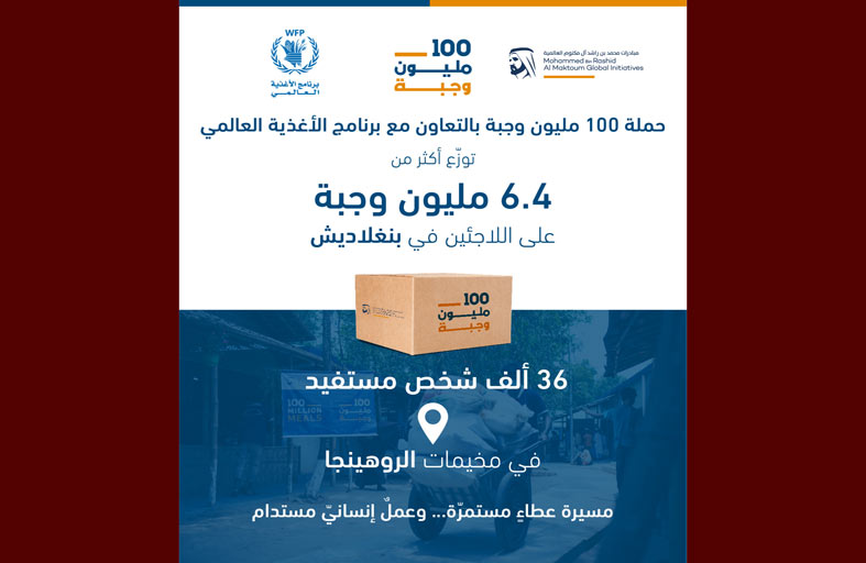 أنجزت "حملة 100 مليون وجبة، الأكبر في المنطقة لإطعام الطعام في 30 دولة و4 قارات، توزيع ما يعادل 6.4 مليون وجبة بصيغة قسائم تموينية فورية، بالشراكة مع برنامج الأغذية العالمي التابع للأمم المتحدة، على لاجئي الروهينجا في بنغلاديش، لتقديم الدعم الغذائي المباشر لهم، ضمن جهود الحملة لمد يد العون للمحتاجين في المجتمعات الأقل دخلا في الدول التي تشملها في العالم العربي وآسيا وإفريقيا وأوروبا وأمريكا اللاتينية.