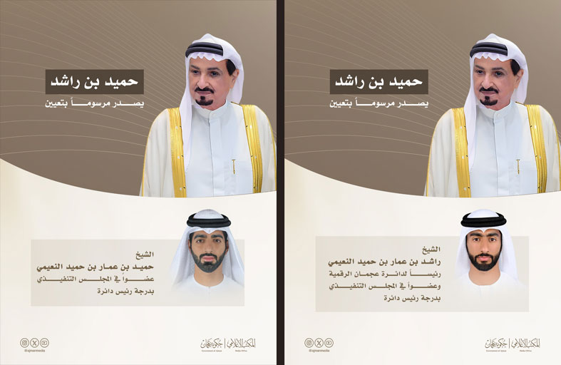 حميد بن راشد يصدر مرسومين أميريين بتعيين حميد بن عمار عضواً في المجلس التنفيذي بعجمان بدرجة رئيس دائرة وراشد بن عمار رئيساً لدائرة عجمان الرقمية وعضواً في المجلس التنفيذي