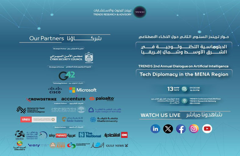 تنطلق اليوم الخميس 13 نوفمبر2025 ،أعمال "حوار مركز تريندز للبحوث والاستشارات السنوي الثاني حول الذكاء الاصطناعي" ، بالشراكة الاستراتيجية مع مجلس الأمن السيبراني، و23 جهة شريكة تحت عنوان: "الدبلوماسية التكنولوجية في الشرق الأوسط وشمال إفريقيا"، بمشاركة باحثين وخبراء من مركز الدراسات الاستراتيجية والدولية الأمريكي (CSIS)، إلى جانب متحدثين من شركات غوغل وأوبن أيه آي (OpenAI) وG42، وGC REAIM وجامعة خليفة، وجامعة محمد بن زايد للذكاء الاصطناعي ، وجامعة محمد بن زايد للعلوم الإنسانية وجامعة نيويورك أبو ظبي، وجهات علمية وأكاديمية أخرى.